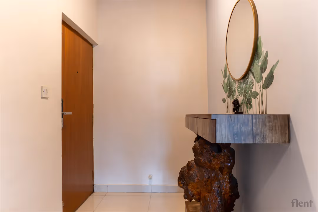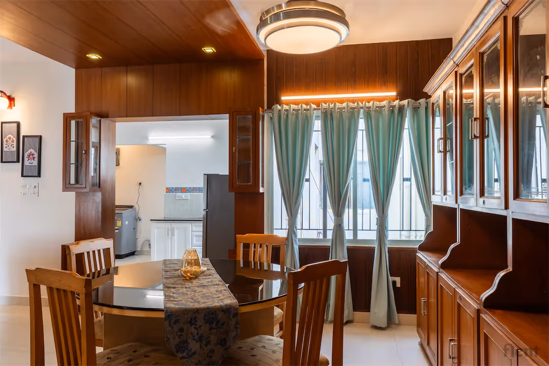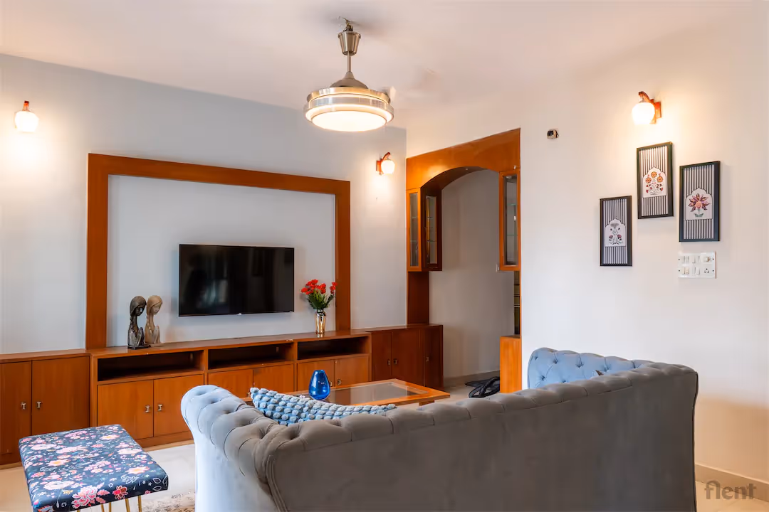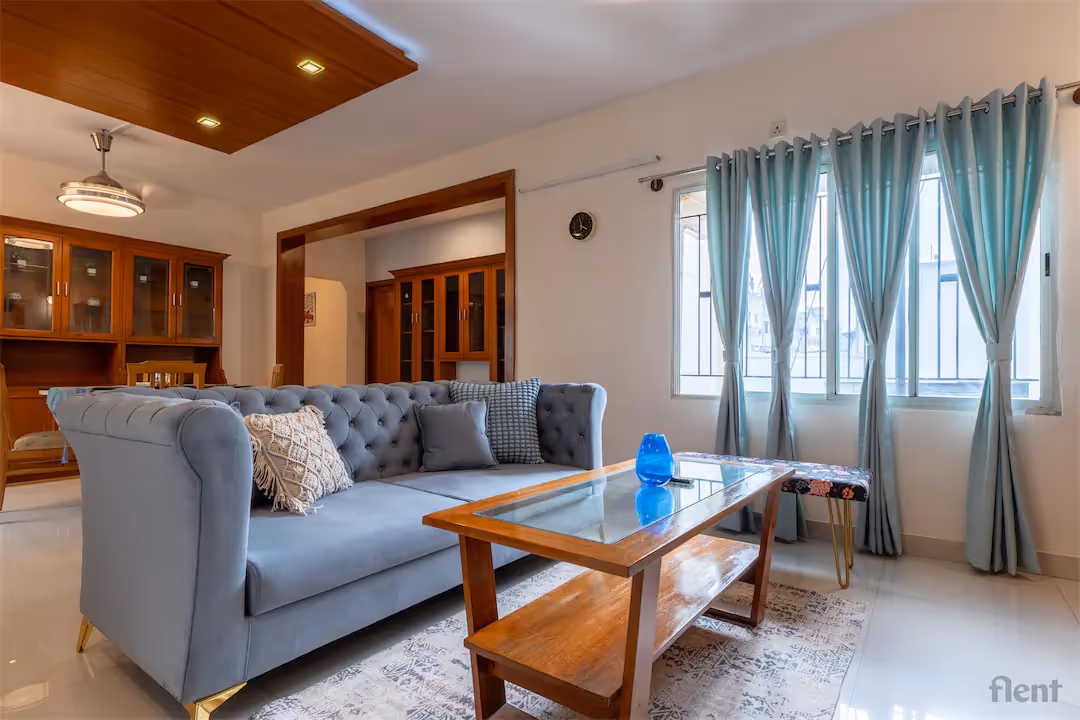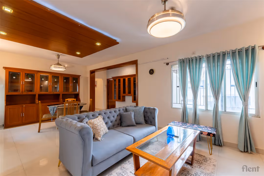 Experience urban living at its finest in this beautifully furnished 2BHK apartment, ideally located just a short walk from Cubbon Park Metro Station. Step into a spacious, sunlit living room featuring elegant décor, a plush tufted sofa, and large windows with stylish curtains that flood the space with natural light. The open-plan layout seamlessly connects the living and dining areas, complemented by tasteful wooden cabinetry and modern lighting fixtures for a warm, inviting ambiance. The apartment’s contemporary design, combined with thoughtful touches like a glass-top coffee table and cozy seating, makes it perfect for relaxing or entertaining guests. Whether you’re a professional seeking connectivity or a family looking for comfort, this home offers the perfect blend of location, style, and functionality—just steps away from Bengaluru’s green heart and major transport links.