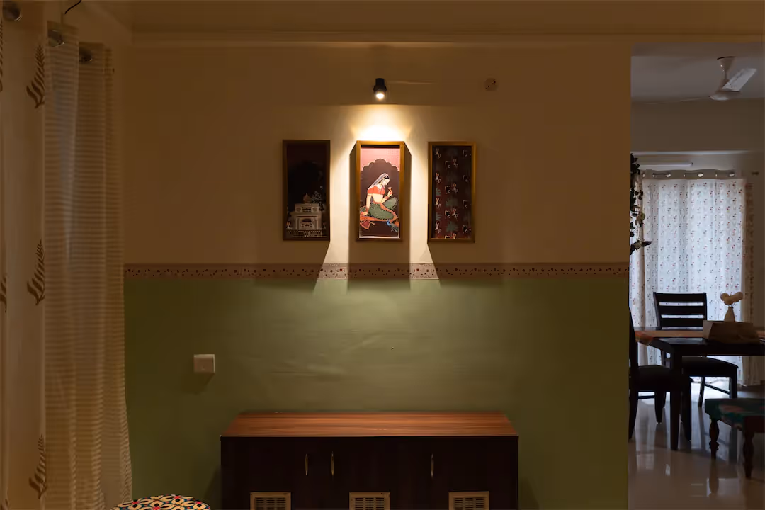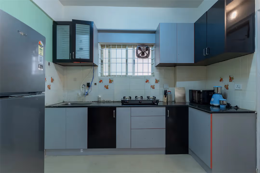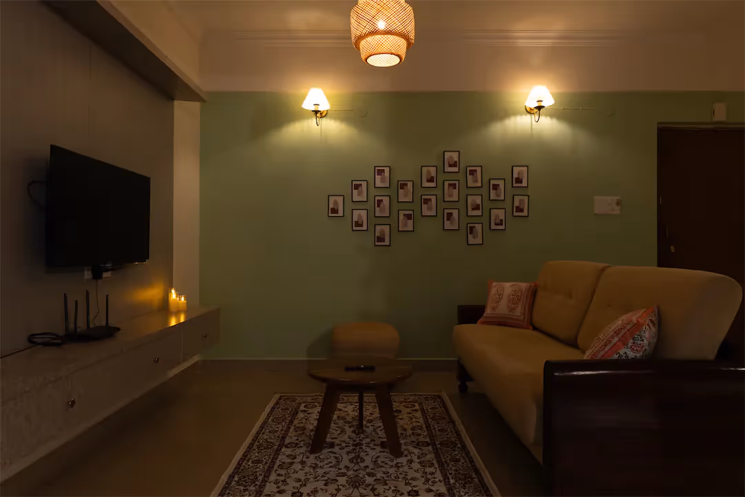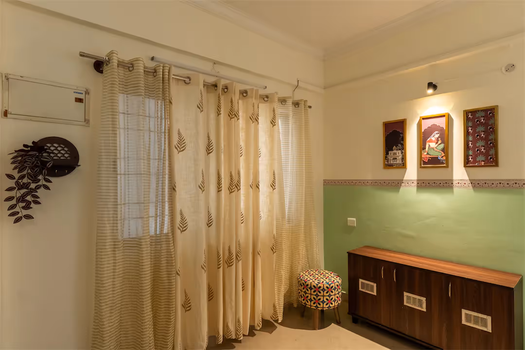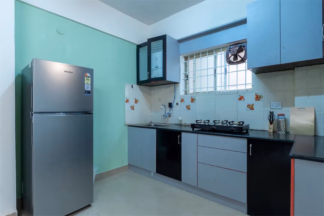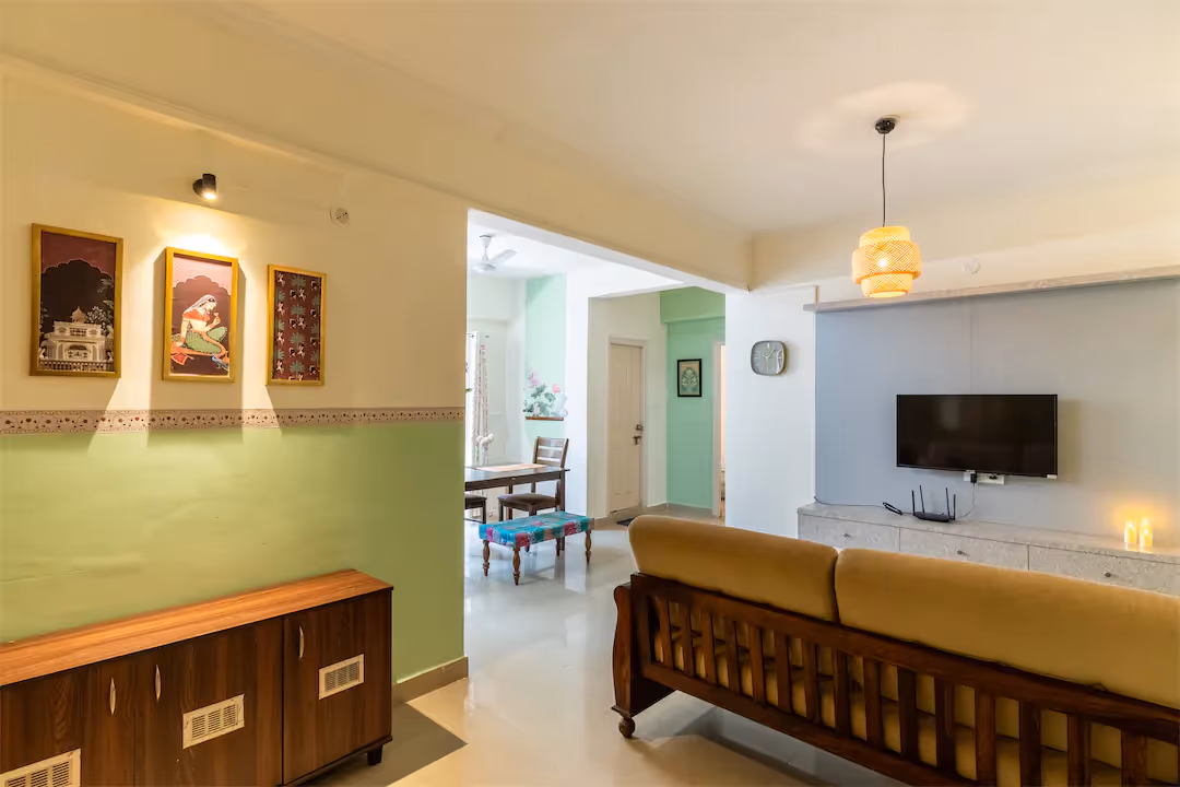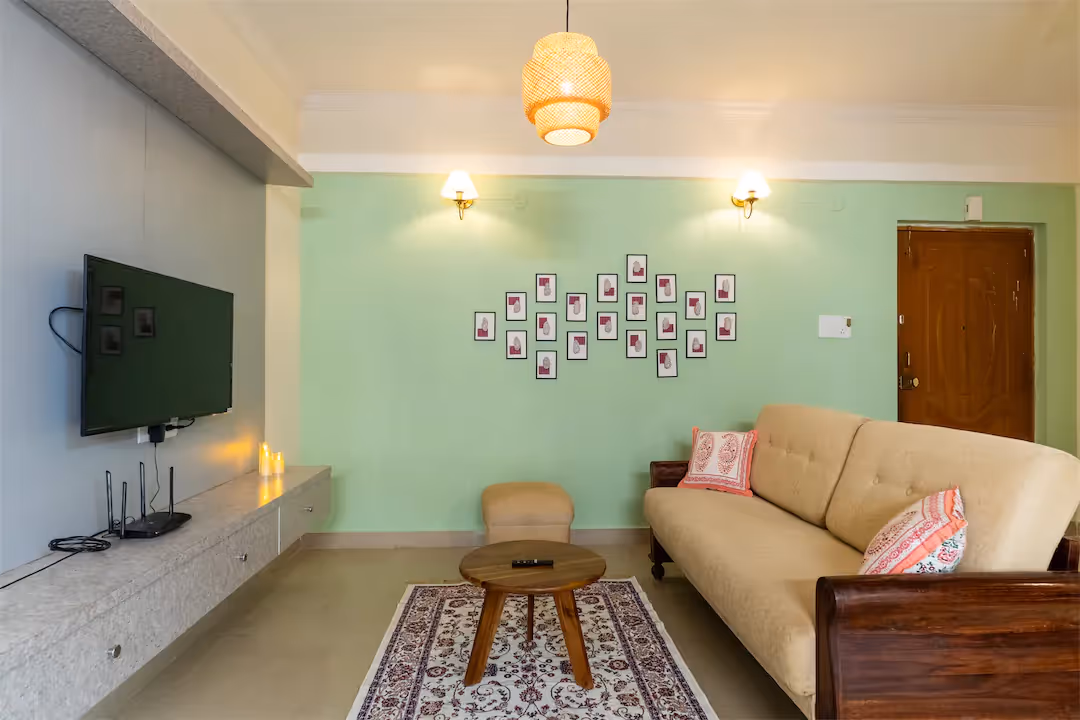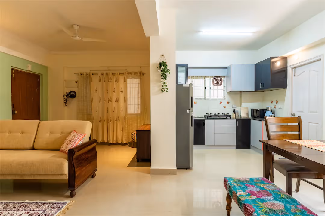 This 2BHK on the 3rd floor blends easy warmth with fresh, modern comfort. The soft sage-green accents and natural textures bring a calming energy, while the open dining and kitchen space feels bright and lived-in. It's the kind of home that makes everyday routines feel unhurried, whether it's a slow breakfast by the window or evenings spent winding down in the cozy living area. The layout is practical, with plenty of light and thoughtful design touches throughout. Set in a well-connected pocket of Bellandur, it is close to Outer Ring Road, tech parks, cafes, and essentials; ideal for those who want convenience without giving up calm.