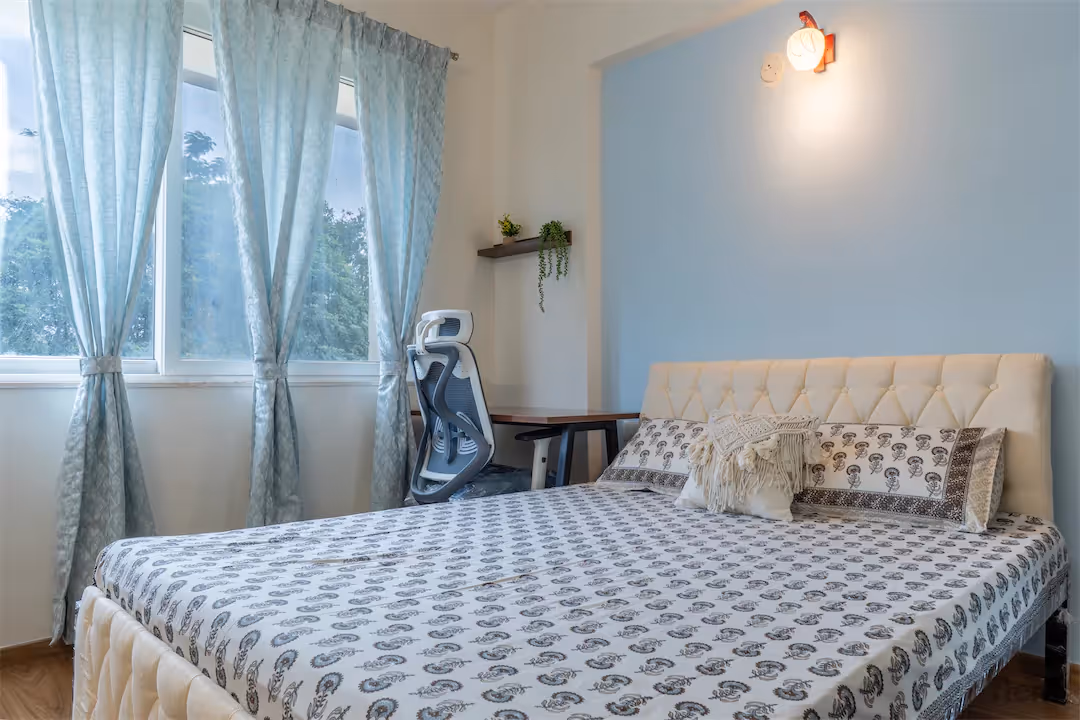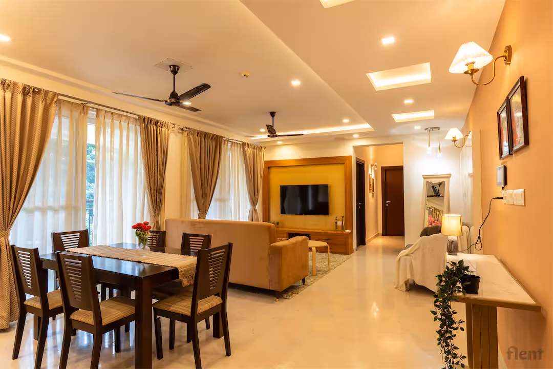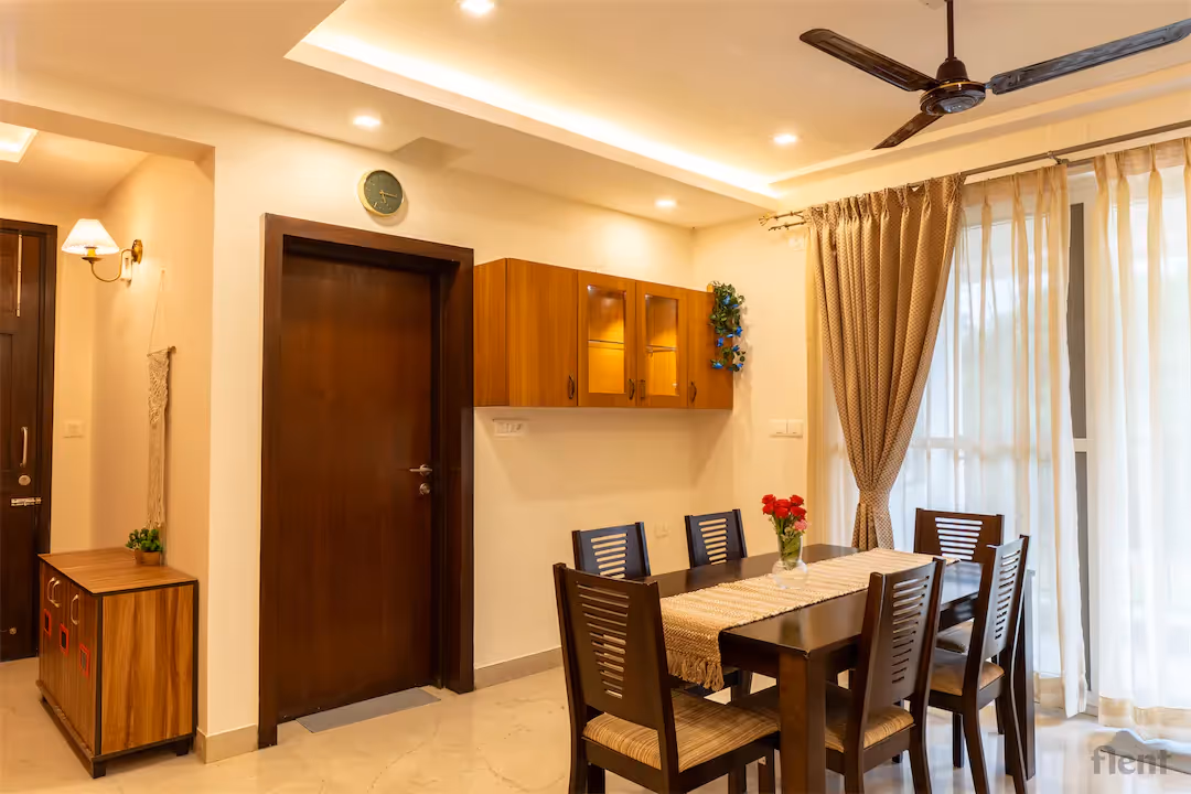 Step into this elegantly furnished 3BHK home in Hebbal, designed to offer a seamless blend of comfort and style. With a warm, well-lit living and dining area, tasteful décor, and large windows that invite in natural light, the space feels both spacious and inviting. Each bedroom is thoughtfully set up with queen/king beds, ample storage, and soft furnishings to ensure restful living. The home comes fully equipped with a modular kitchen, smart TV, inverter, high-speed Wi-Fi, and all essential appliances — making it completely move-in ready. Located in a premium gated community with access to top-tier amenities like a swimming pool, gym, clubhouse, and 24x7 security, this home is ideal for families or working professionals looking for a peaceful, plug-and-play lifestyle in North Bangalore.
