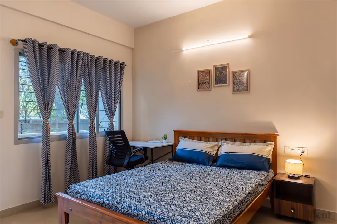 This home redefines modern urban living with its striking contemporary design and thoughtfully curated interiors. Step into a grand living space flooded with natural light from floor-to-ceiling windows, where plush sofas, rich dark wood accents, and a unique cloud-like light fixture create an inviting atmosphere for both relaxation and entertaining. The open-plan layout seamlessly connects the living and dining areas, framed by elegant decor and a soothing color palette that fosters tranquility. Each bedroom is designed for comfort and privacy, featuring queen-size beds, dedicated workspaces, and private balconies that offer a serene retreat from city life. The fully equipped kitchen and sleek modern appliances add to the home’s functionality, while tasteful furnishings and soft draperies enhance its sophisticated aesthetic. Set within a peaceful gated community, Elysian II blends timeless elegance with everyday convenience, making it a perfect sanctuary for professionals who appreciate design, comfort, and a sense of belonging in Bengaluru’s vibrant HSR neighborhood