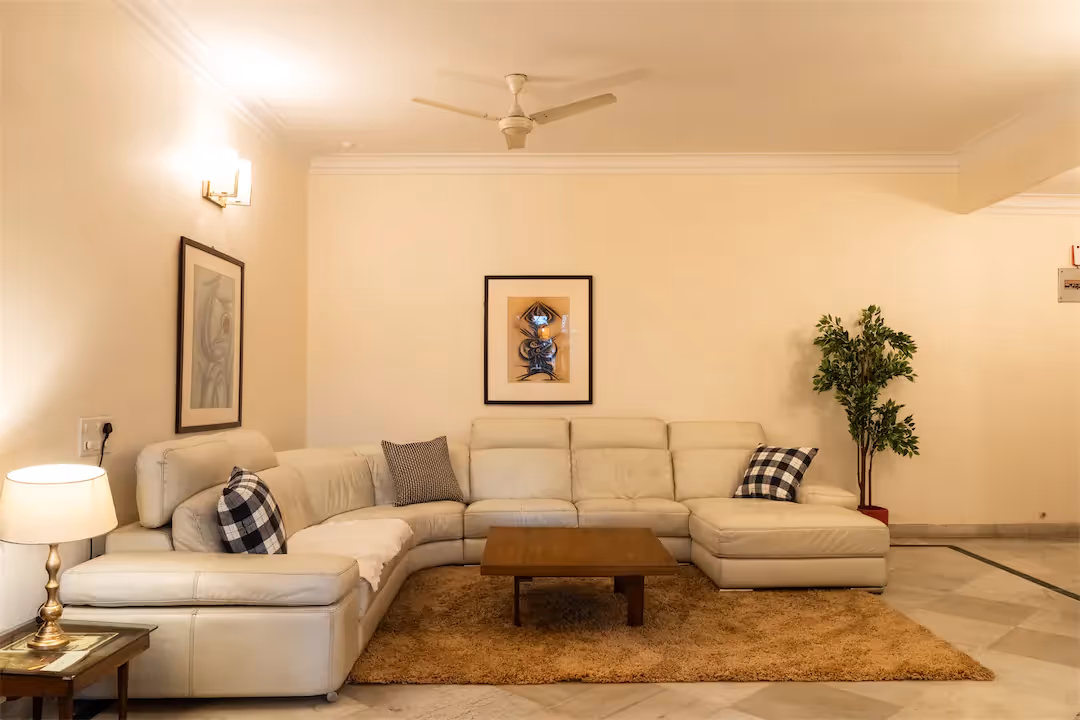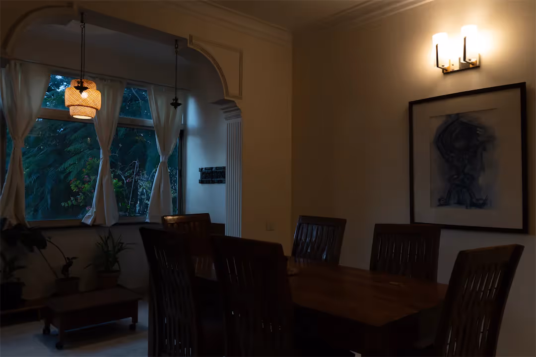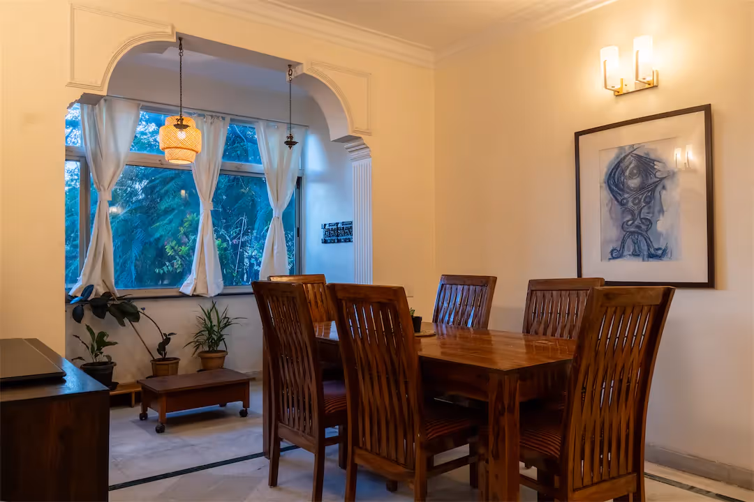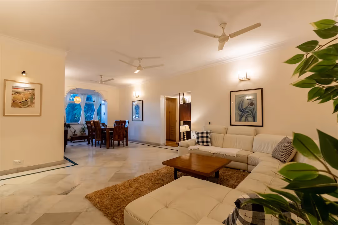 Spacious, bright, and quietly elegant — this 3BHK brings a sense of calm right in the middle of the city. The large living area opens into a dining space framed by arched windows and leafy views, filling the home with light through the day. Soft tones, marble floors, and warm wooden accents make the space feel timeless and grounded. You’re minutes away from MG Road, Cunningham Road, and Vasanth Nagar — with cafés, hospitals, and parks all close by. It’s the kind of home that feels tucked away yet connected to everything that matters.