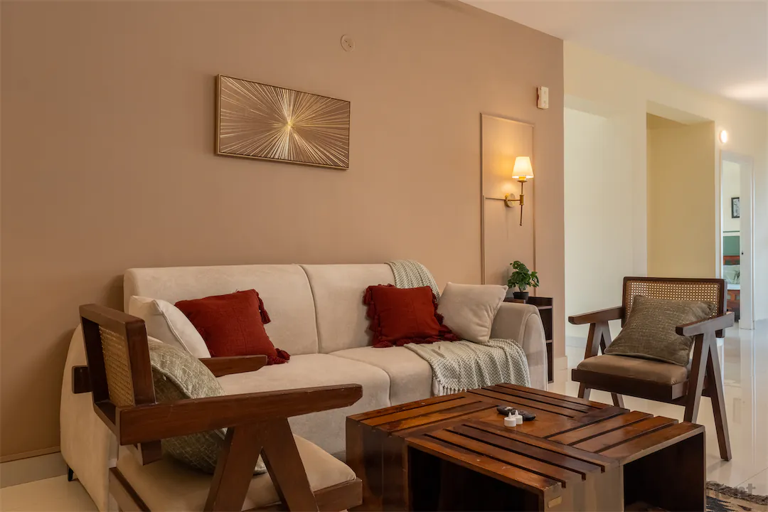 Step into a home that radiates calm sophistication, where modern minimalism meets warm, earthy tones. This thoughtfully designed 3BHK invites you to slow down and enjoy everyday living, with a living room that balances comfort and elegance through clean lines, natural light, and tasteful accents. The soft beige and clay-inspired palette creates a grounding ambiance, complemented by sleek furniture and subtle décor touches that make every corner feel intentional. Whether it’s unwinding with loved ones in the cozy lounge, hosting dinners with ease, or finding quiet moments by the warm glow of wall sconces, this home seamlessly blends functionality with charm. Perfect for those who value both style and serenity, it’s more than just a residence—it’s a space that feels alive, welcoming, and deeply personal.